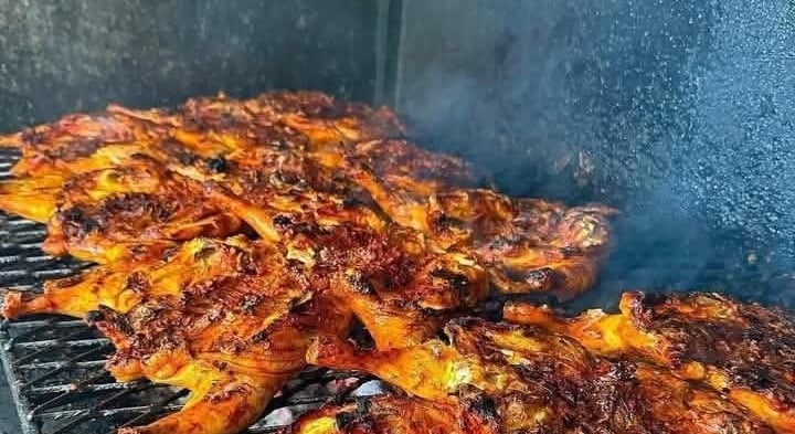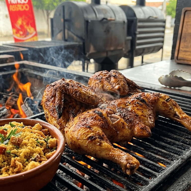 O autêntico sabor do fogo: nosso frango é grelhado diretamente na brasa para garantir aquela pele defumada e crocante, mantendo a carne sempre macia, suculenta e com o aroma irresistível do churrasco raiz.